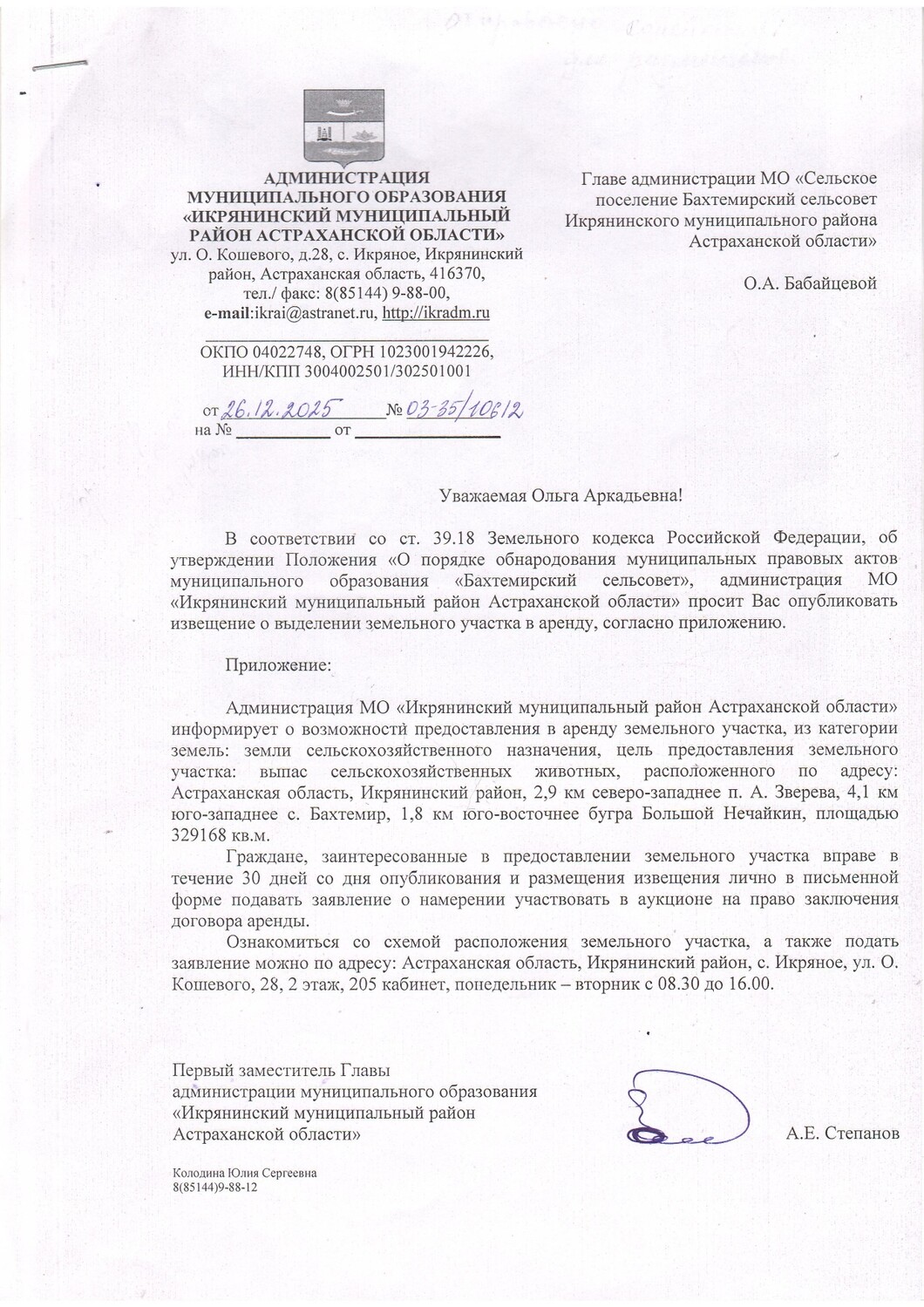 Администрация МО " Икрянинский муниципальный район Астраханской области" информирует о выделении в аренду земельного участка Прикрепления: Картинка 1 · Картинка 2 | |